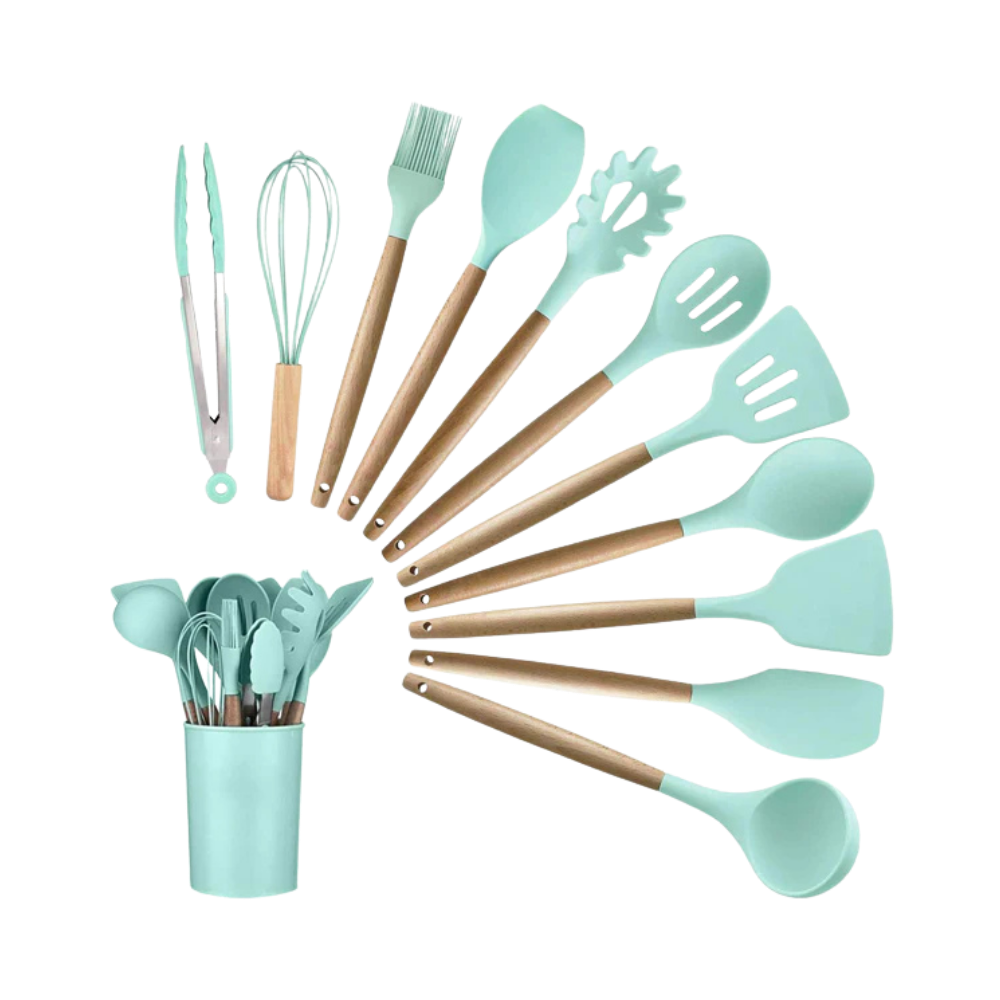 A complete set of heat-resistant silicone utensils designed for safe and efficient cooking. Flexible, durable, and easy to clean, these tools are perfect for non-stick cookware and everyday kitchen use.